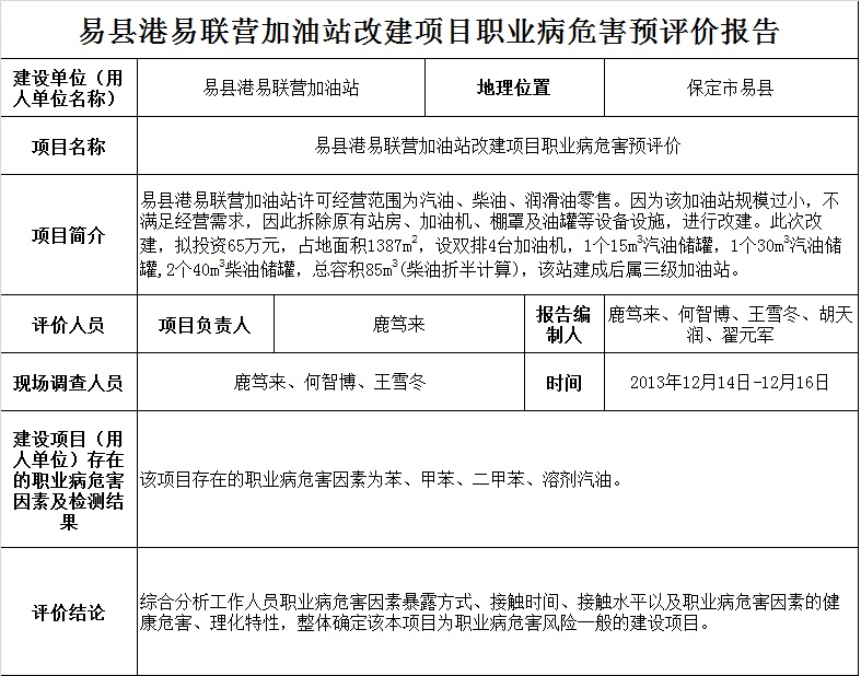 易县港易联营加油站改建项目职业病危害预评价