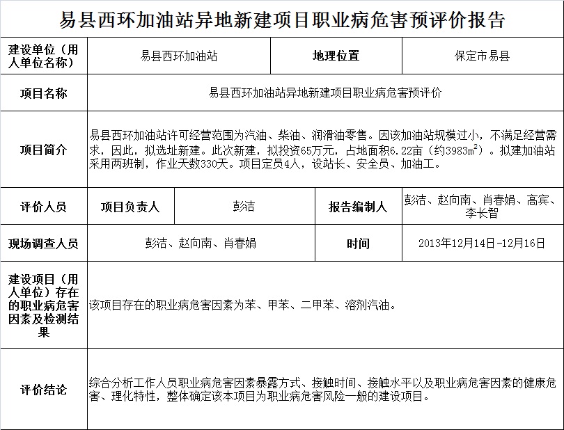 易县西环加油站异地新建项目职业病危害预评价
